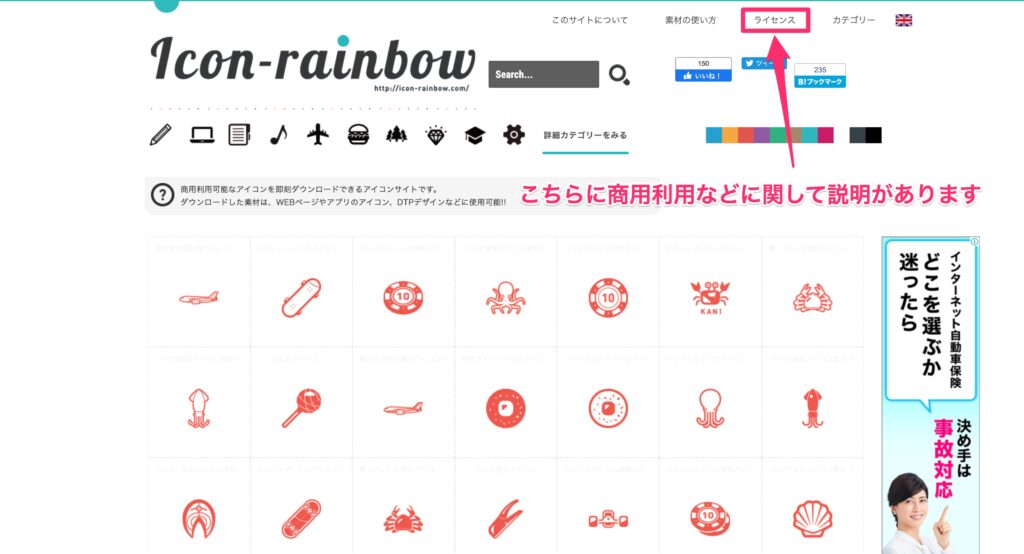 Icon rainbowにアクセス後、サイト右上に「ライセンス」という項目があるのでクリックします。