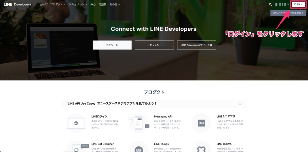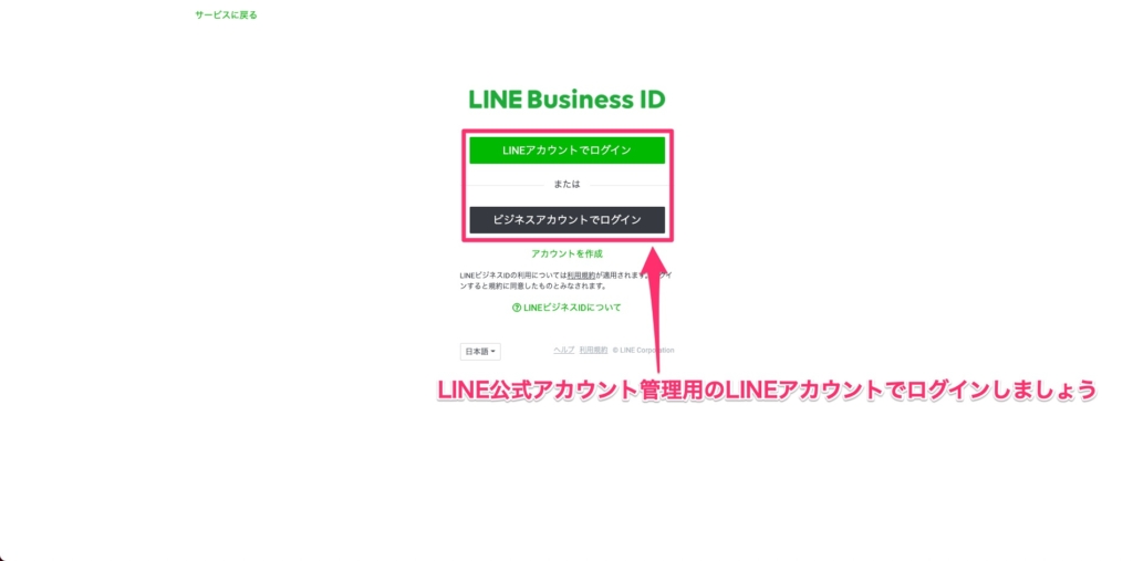 今回はLINEアカウントでログインしましょう。(実際にクライアントワークを請け負う場合は別途ビジネスアカウントを作成するようにしましょう。)