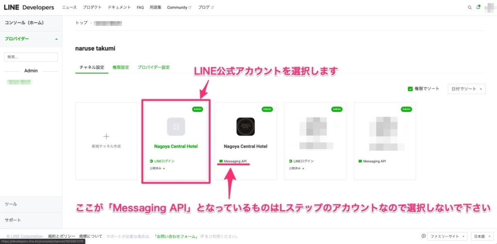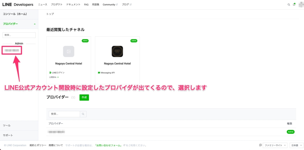 画面左のメニューからプロバイダをクリックすると、LINE公式アカウント開設の際に作成したプロバイダがあるはずです。