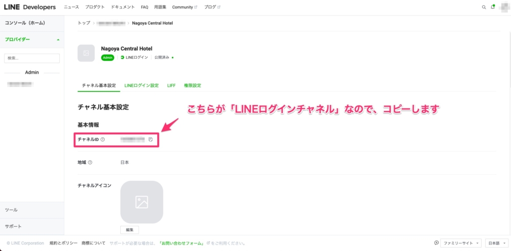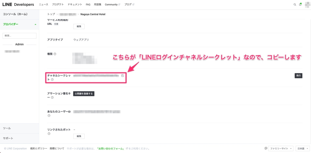 「チャネルID」、「チャネルシークレット」という項目があるのでそれぞれをコピーします。