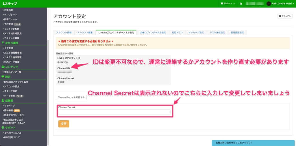 「Channel ID」が間違っている場合は変更できないので、運営に連絡するorアカウントを作り直すしかないです。ただしアカウントを作り直す場合は、LINE公式アカウントも作り直す必要があるので注意してください。