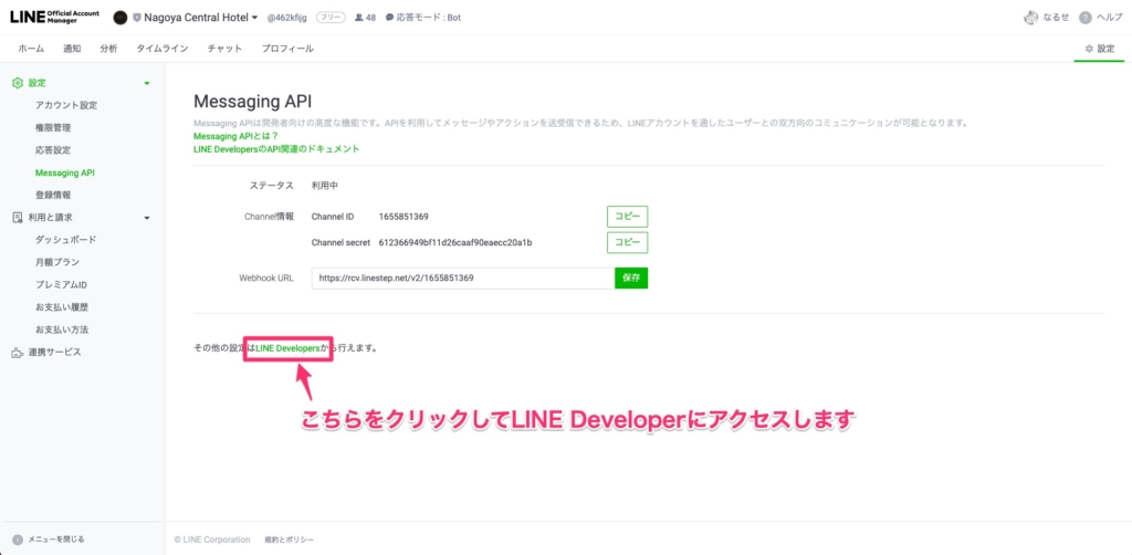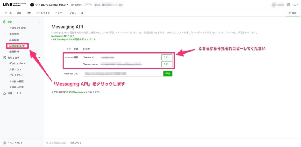 LINE公式アカウント設定画面から「Messeging API」を開いて「channel ID」と「channel secret」を確認します。