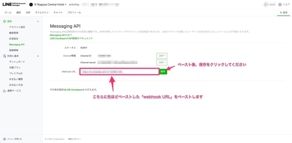先程のLINE公式アカウントの設定画面へ戻り、コピーした「webhook URL」をペーストします。