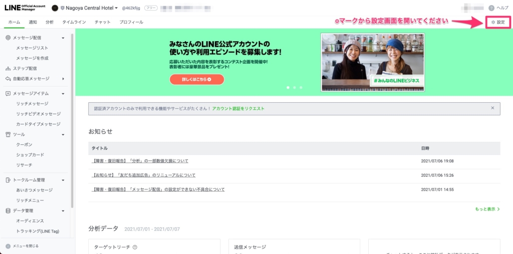 Lステップアカウントを解説すると下記のような画面が表示されます。これがLステップの初期設定画面です。