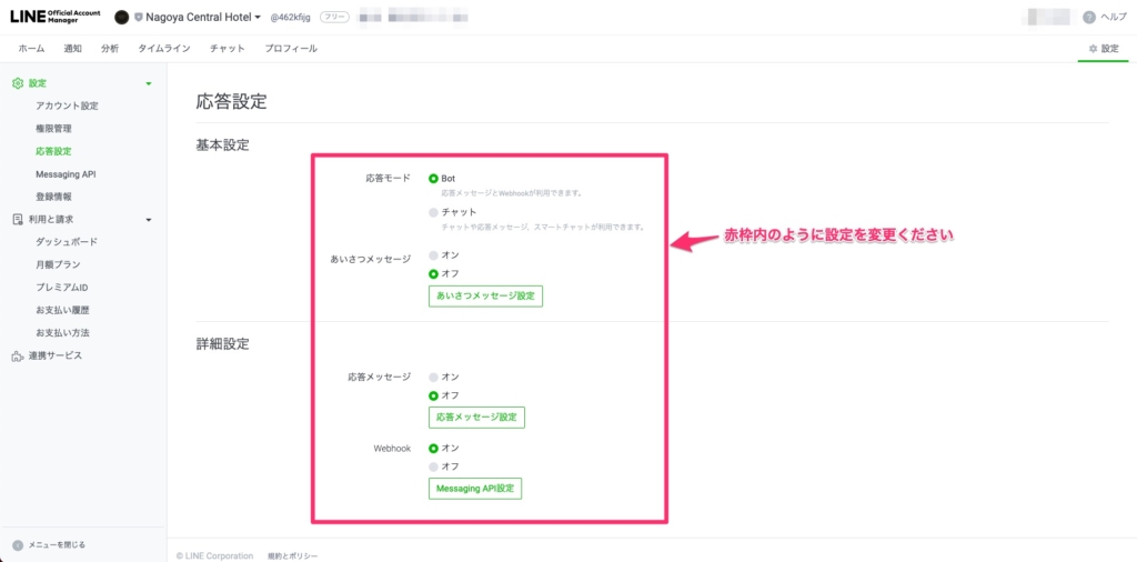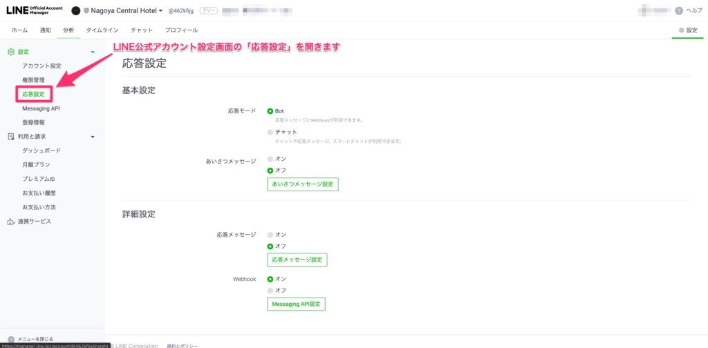 LINE公式アカウントの設定画面から「応答設定」を開きます。