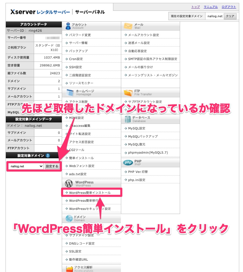 まずはサーバー管理画面へ戻ります。設定対象ドメインが先ほど取得したドメインになっていることを確認して、「Wordpress簡単インストール」をクリックします。