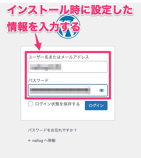 ログイン画面が表示されるので、Wordpressインストール時に設定した情報を入力しましょう。