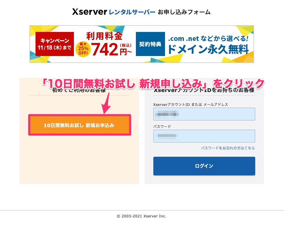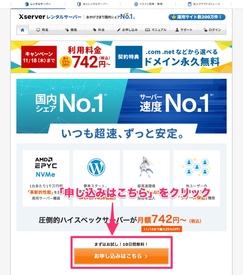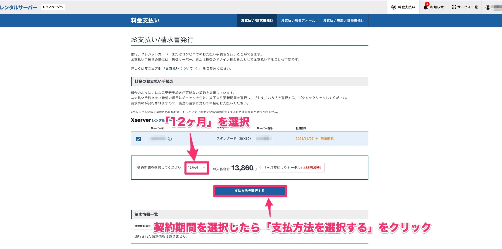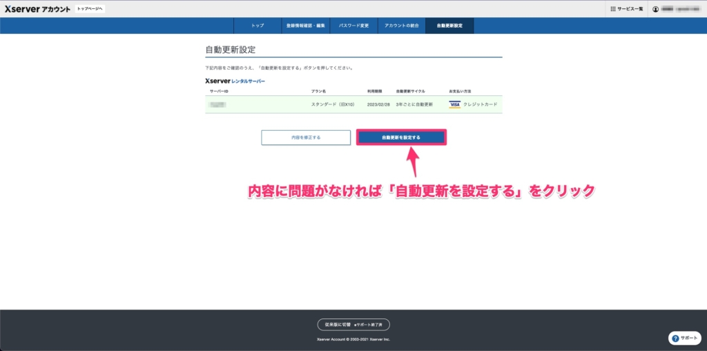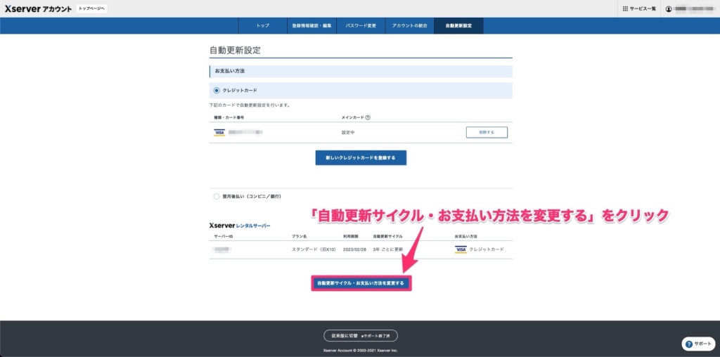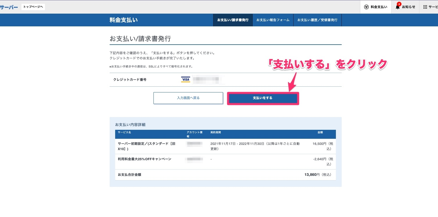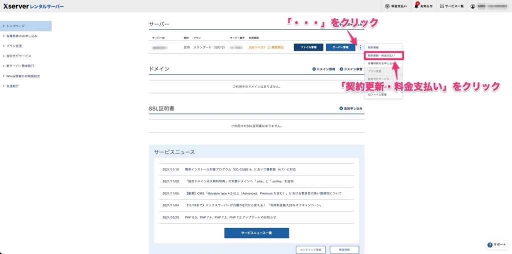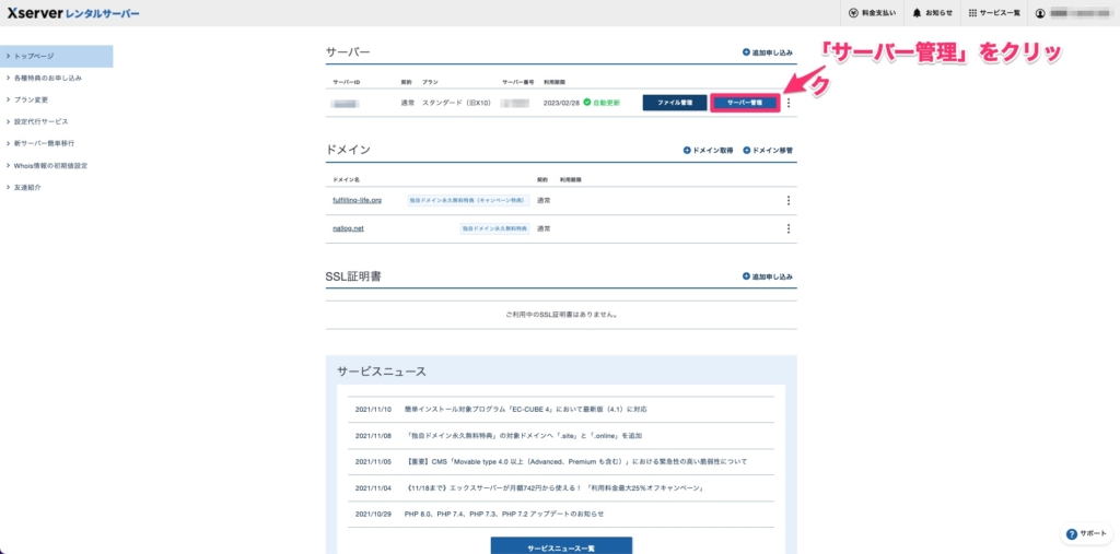 まずはサーバー契約ホーム画面の「サーバー管理」をクリックします。
