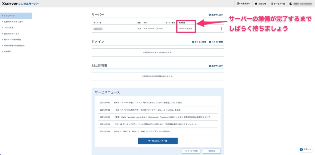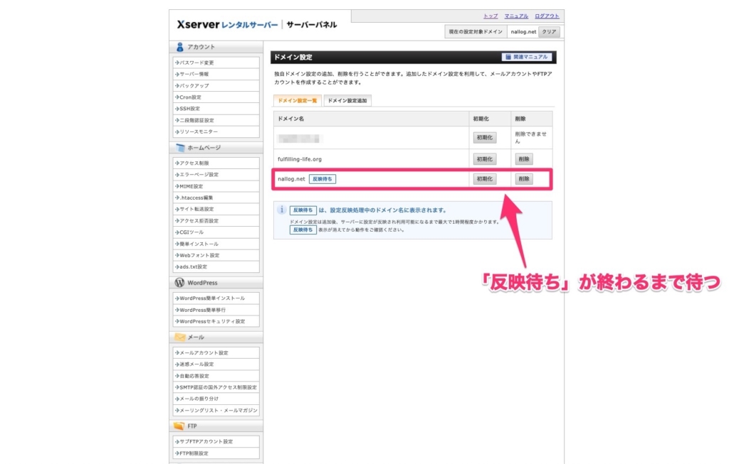 ドメイン一覧に戻ります。しばらくは反映待ちと表示されているので待ちましょう。