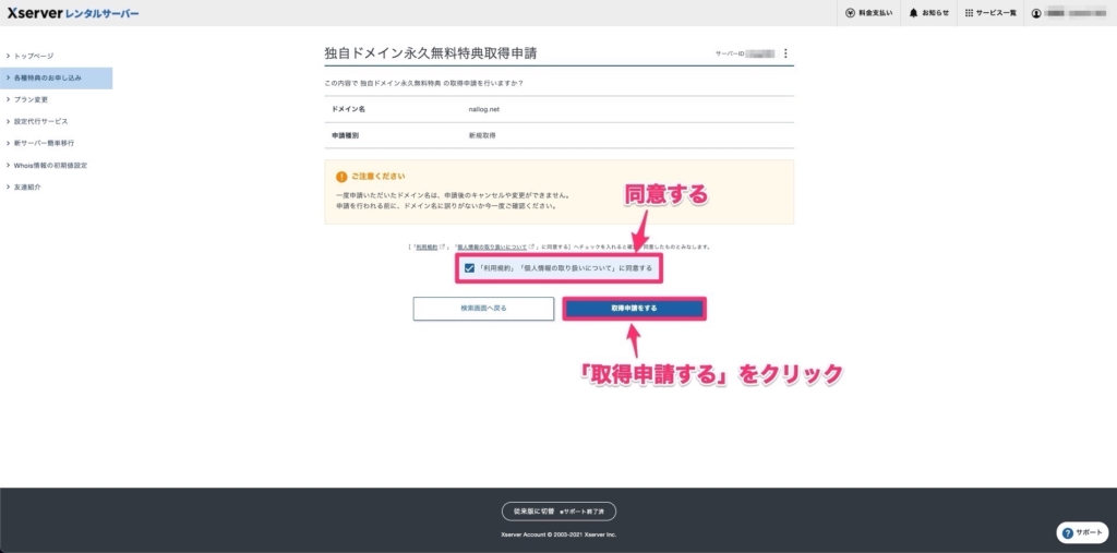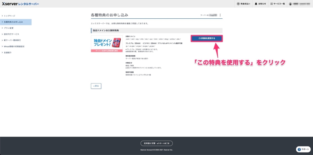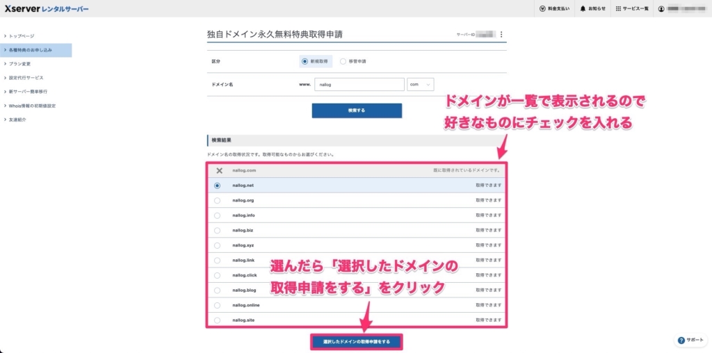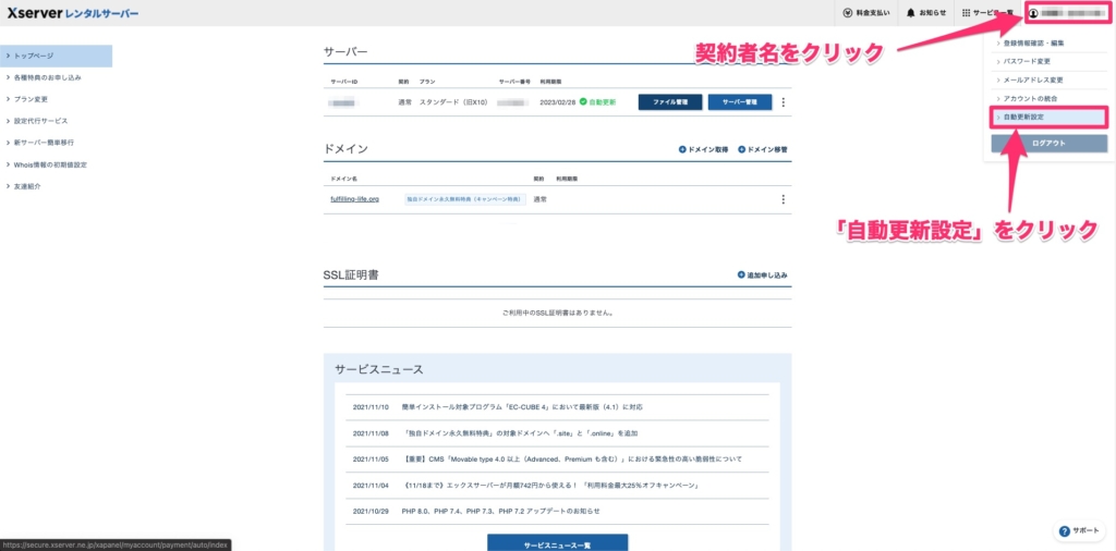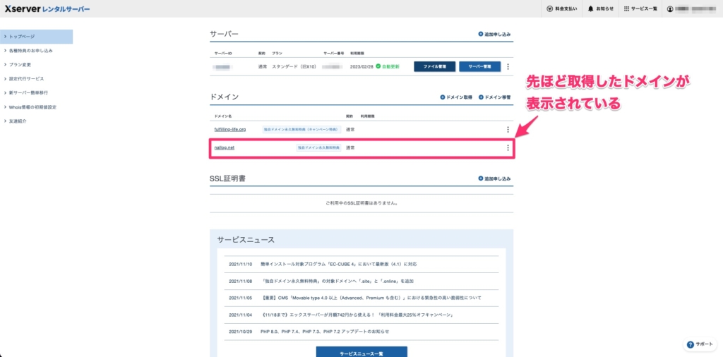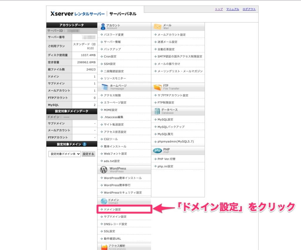 まずは管理ページのホーム画面で設定対象ドメインが今回取得したドメインになっているか確認しましょう。