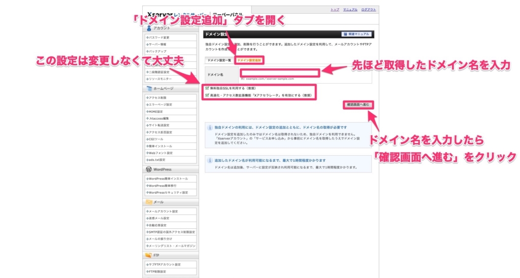 ドメイン設定画面が開くので「ドメイン設定追加」タブに切り替えます。そこに先ほど取得したドメイン名を入力しましょう。入力できたら確認画面へ進むをクリック。(チェックボックスは変更しなくてOKです)