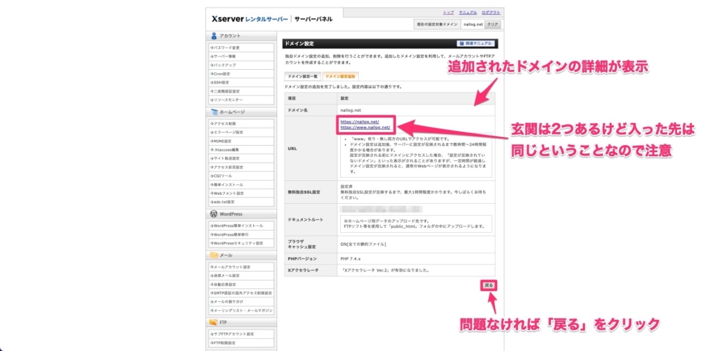 追加されたドメインの詳細が表示されます。URLの欄にアドレスが2つありますが、今回取得したドメインで設定できるサイトは一つなので注意してください。(一つのサイトに玄関が2つあるイメージ)