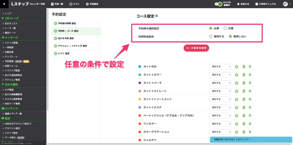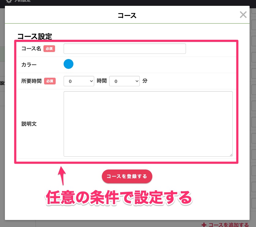 続いてコースを準備しておきましょう。予約枠が「誰に(どこで)」だとしたら、コースは「何をしてもらうのか」と考えてもらうと分かりやすいと思います。
