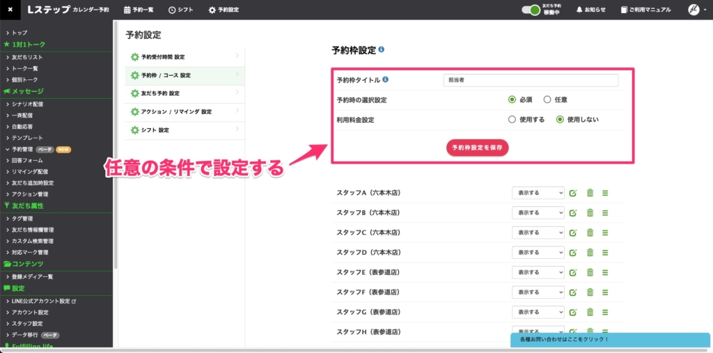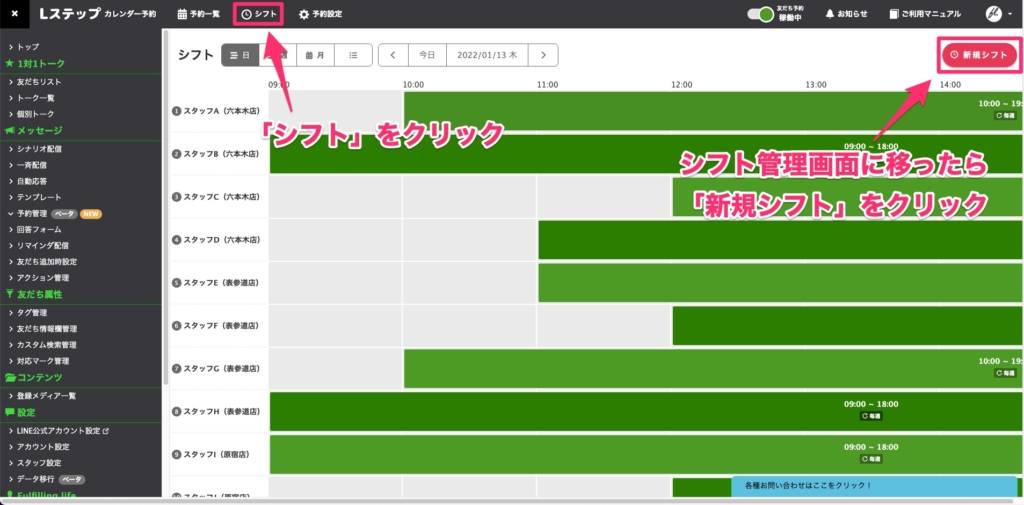 続いては予約枠ごとの「シフト」を設定していきましょう。せっかく予約枠を設定しても、シフトが設定できていないとお友だちが予約できないので注意してください。