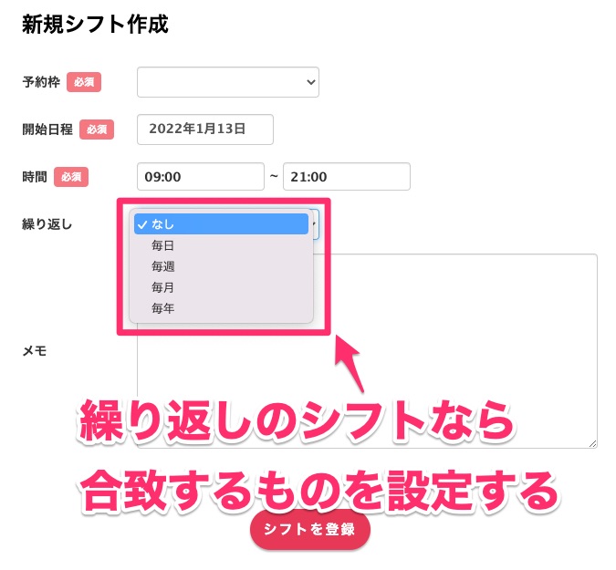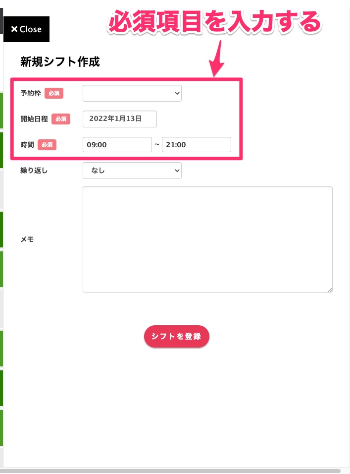 シフトの設定画面が出てくるので、どの予約枠ごとのシフトを設定しましょう。