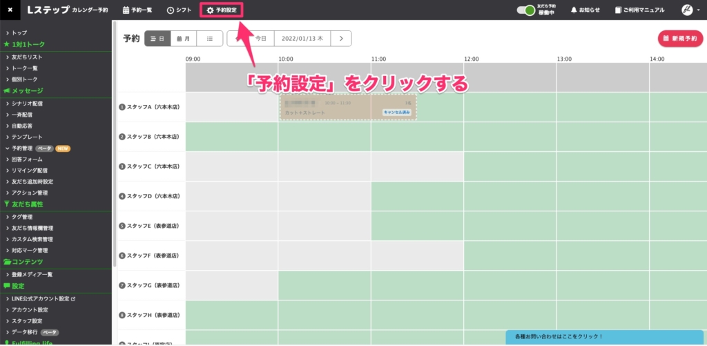 上部のメニューから「予約設定」をクリックします。