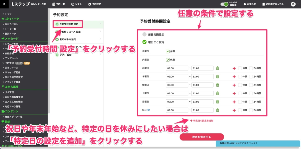 予約設定のメニューから「予約受付時間 設定」をクリックして、予約の受付時間を設定しましょう。