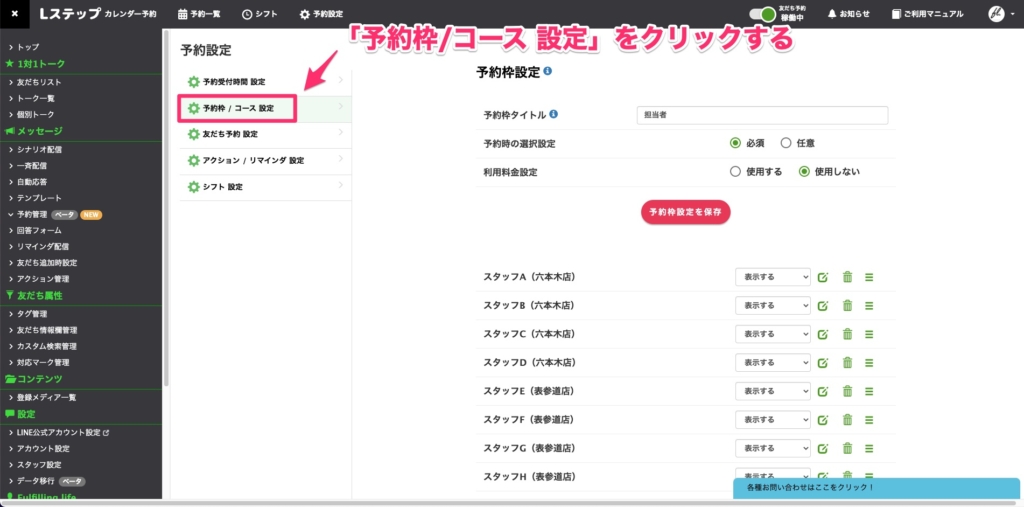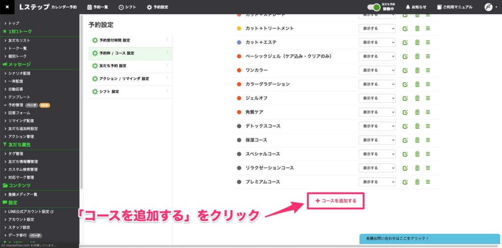 引き続き、予約設定のメニューから「予約枠/コース 設定」をクリックします。