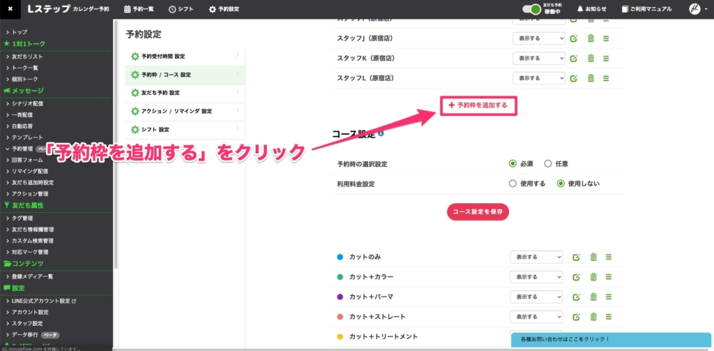 続いて「予約枠/コース」の設定をしていきましょう。