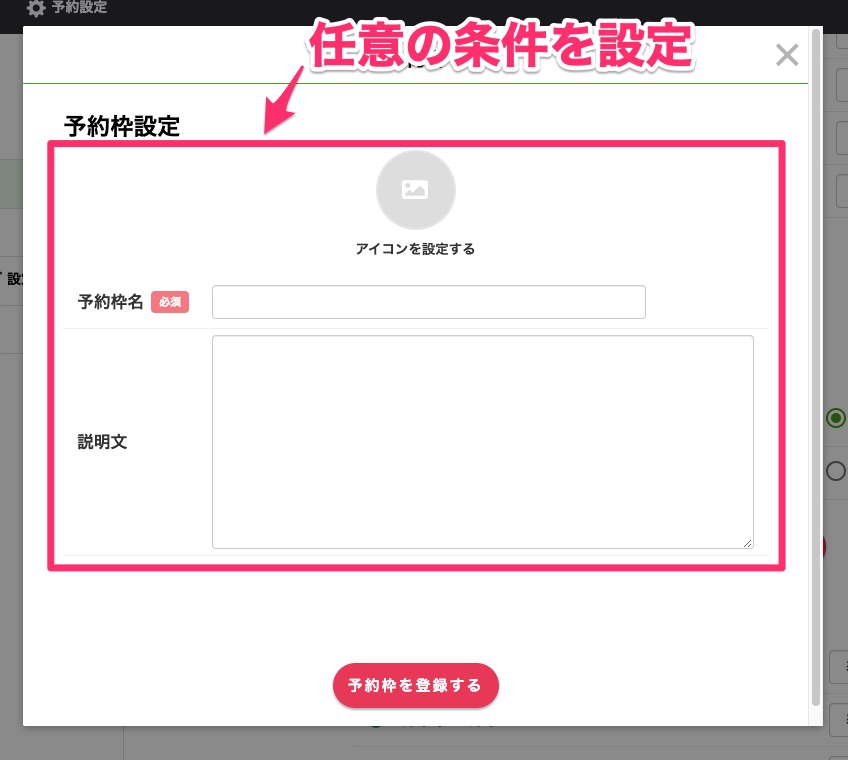 すると予約枠の詳細を設定する画面が現れるので、アイコンや予約枠名、説明を入力していきましょう。